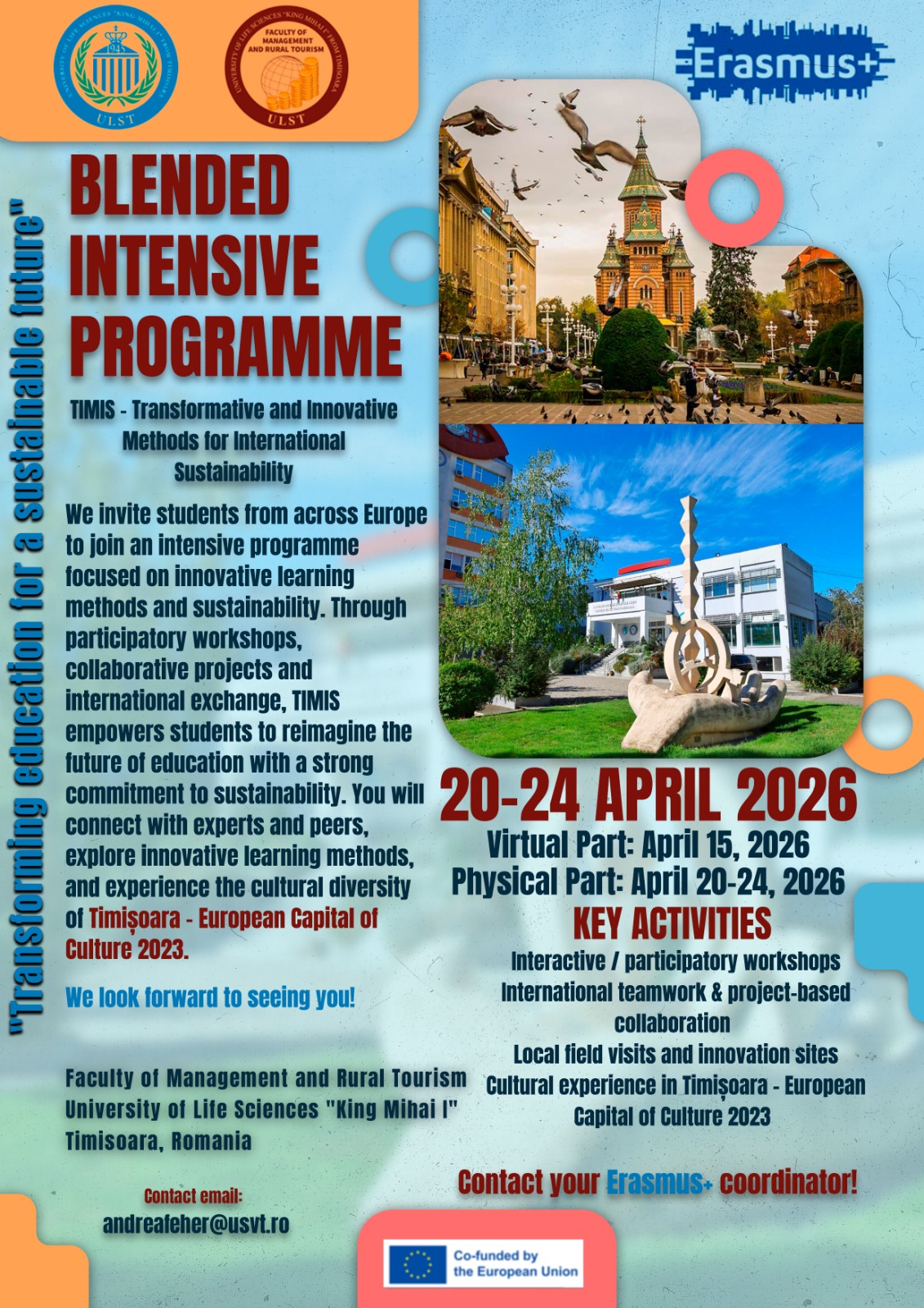 Отворен је позив за пријаву студената за мобилност у оквиру програма који се реализује у Темишвару (Румунија), у периоду 20-24. април 2026. године, уз претходни виртуелни део 15. априла 2026.
